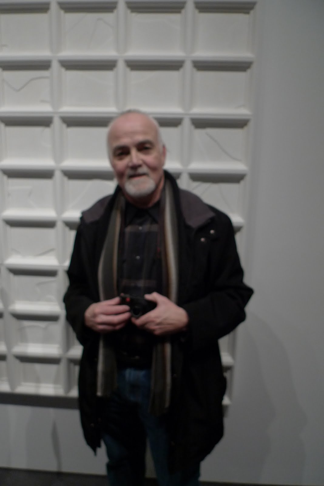 It’s a great bonus living in Boulder to have access to the university. Tonight there was an opening at the new CU Fine Arts Museum of faculty art work. Saw my sculpture professor, Garrison Roots from 1986 who is now head of the department as well as a sculptor. Here he is in front of his piece which is covered with that fuzzy material you find in a jewelry box.